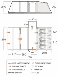 Vango have made a big improvement to their Sentinel fabric for the new season. This latest material has been dyed in a different method which not only increases the colour retention of the fabric but also the process uses 60% less water making it more eco-friendly. With a waterproof rating of 3,000mm HH, it is armoured with more than enough to cope with the typical British weather. The tent has key features such as dark ‘Nightfall bedrooms’ which enable you to have a longer and better night’s sleep as you won’t be waking up when the sun does. Inside the bedroom there are also storage pockets to give you an easily accessible point for storing items like phones or torches so you can find them in the middle of the night. Other important features include cable entry points, privacy curtains, mesh windows internally and low-level panels externally; one of our favourite features is the drop-down doors. Unlike previous years Vango have added extra toggle points to the lip to decrease the chance of the wind from coming in.