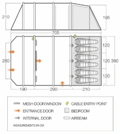 Vango have made a big improvement to their Sentinel fabric for the new season. This latest material has been dyed in a different method which not only increases the colour retention of the fabric but also the process uses 60% less water making it more eco-friendly. With a waterproof rating of 3,000mm HH, it is armoured with more than enough to cope with the typical British weather. The tent has key features such as dark ‘Nightfall bedrooms’ which enable you to have a longer and better night’s sleep as you won’t be waking up when the sun does. Inside the bedroom there are also storage pockets to give you an easily accessible point for storing items like phones or torches so you can find them in the middle of the night. Other important features include cable entry points, privacy curtains, mesh windows internally and low-level panels externally; one of our favourite features is the drop-down doors. Unlike previous years Vango have added extra toggle points to the lip to decrease the chance of the wind from coming in.