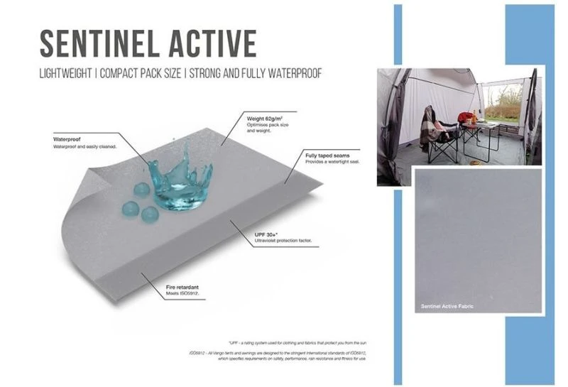 - Sentinel Active Fabric – When pack size and weight are the key influencers in choosing your awning, our specifically designed Sentinel Active fabric will surpass your needs. Sentinel Active is strong, whilst being fully waterproof, ensuring great quality and performance coupled with compact pack sizes